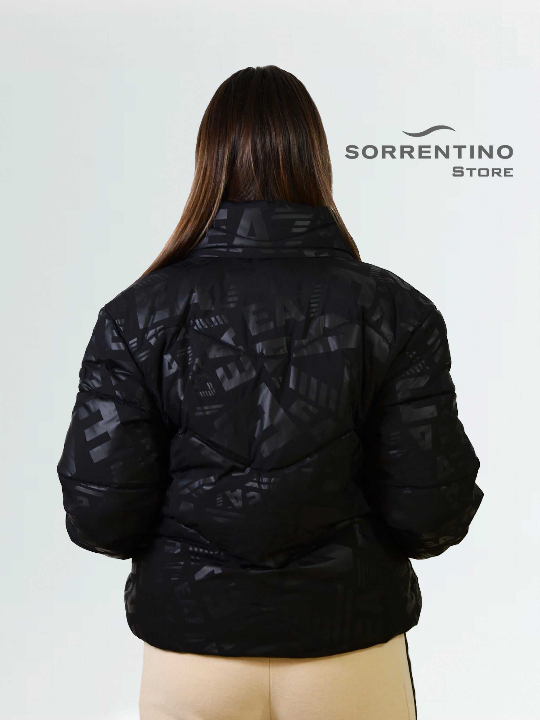 Giacca imbottita da donna EA7 in nylon. Collo alto con cappuccio nascosto, chiusura full-zip, tasche laterali, trapuntatura a onde, motivo monogramma all-over. Vestibilità regolare.